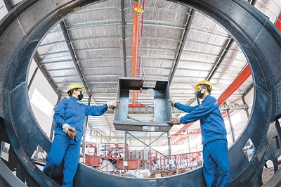 今年以來(lái),江蘇省海安市在科學(xué)防控疫情的同時(shí),及時(shí)為企業(yè)解難紓困,幫助民營(yíng)企業(yè)迅速恢復(fù)產(chǎn)能、拓展國(guó)內(nèi)外市場(chǎng),保持經(jīng)濟(jì)平穩(wěn)運(yùn)行,確保務(wù)工人員有崗上、有活干、有錢賺。圖為5月17日,在海安市白甸鎮(zhèn)一企業(yè)車間內(nèi),工人在趕制建材裝備訂單。翟慧勇攝(人民視覺(jué))