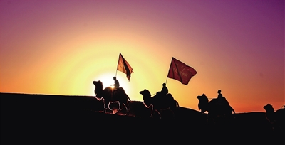 行走在大漠夕陽(yáng)下的駝背宣講團(tuán)。記者 馬建荃 攝