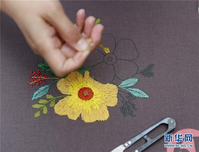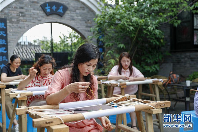 5月23日,在重慶市開州區(qū)古今庭漢繡培訓中心,漢繡繡娘在繡制文創(chuàng)產品。新華社發(fā)(黃偉 攝)
