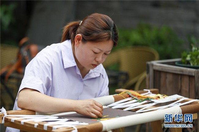 5月23日,在重慶市開州區(qū)古今庭漢繡培訓中心,漢繡繡娘在繡制文創(chuàng)產品。 新華社發(fā)(黃偉 攝)