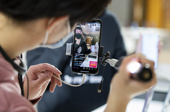 在鄭州市一家商場(chǎng),售貨員利用網(wǎng)絡(luò)直播平臺(tái)介紹手機(jī)商品。新華社供圖