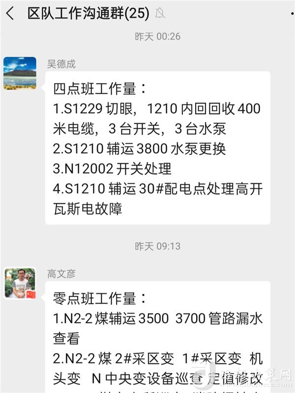“南翼1210回風(fēng)巷回收400米低壓電纜”“南翼1210輔運(yùn)3800米處更換水泵一臺”......凌晨十二點(diǎn)半,剛下晚班的跟班副區(qū)長吳德成便用手機(jī)編輯信息,將當(dāng)班任務(wù)完成情況匯報(bào)至區(qū)隊(duì)工作微信群。