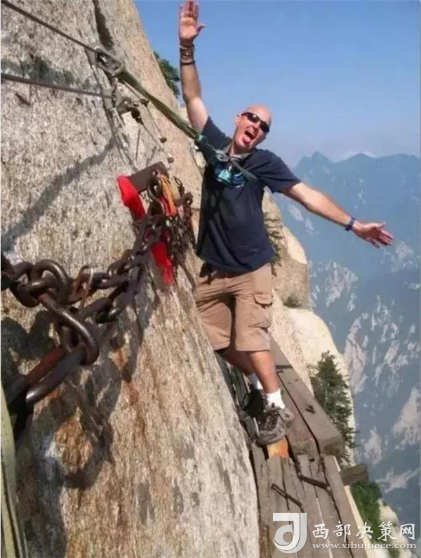 喜歡攀巖徒步,似乎是很多老外的一種標(biāo)志性運(yùn)動(dòng)。幾個(gè)熱愛(ài)徒步攀巖的老外,在華山的棧道上擺pose,挑戰(zhàn)這種世界上最危險(xiǎn)的徒步棧道。