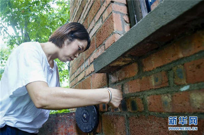 7月1日,地質(zhì)災(zāi)害監(jiān)測員侯芳對一處農(nóng)房的墻上裂縫寬度進行測量。 新華社記者 劉潺 攝