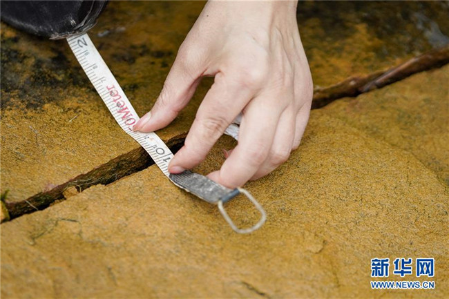 7月1日,地質(zhì)災(zāi)害監(jiān)測員侯芳在古家坳不穩(wěn)定斜坡地質(zhì)災(zāi)害點的一條裂縫前進行測量工作。新華社記者 劉潺 攝