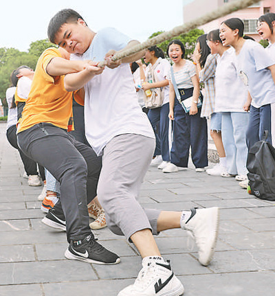 6月28日,湖南省道縣第一中學(xué)高三學(xué)生在進(jìn)行拔河比賽放松心情。何紅福攝(人民視覺(jué))