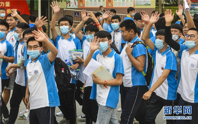 7月8日,在福建省福州教育學院附屬中學考點,考生和同學揮手告別。 當日,全國部分地區(qū)2020年高考結束。 新華社記者 宋為偉 攝