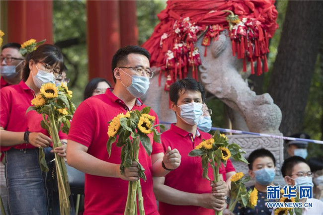 7月8日,在黑龍江省哈爾濱市第三中學考點外,老師拿著向日葵迎接考生。 當日,全國部分地區(qū)2020年高考結束。 新華社發(fā)(張濤攝)