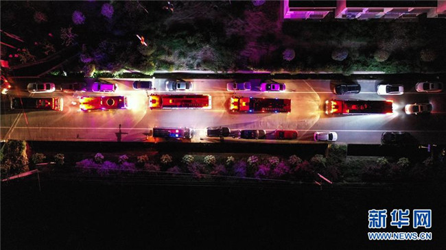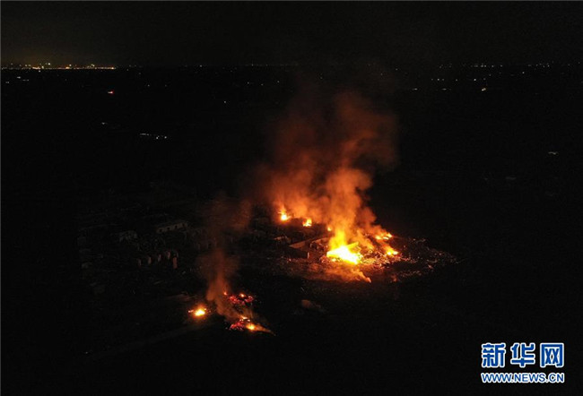 截至9日3時,事故現(xiàn)場火勢已得到控制,但仍有明火。由于對爆炸品是否已燃完情況不明,救援人員通過無人機空中觀察,在警戒線外待命。