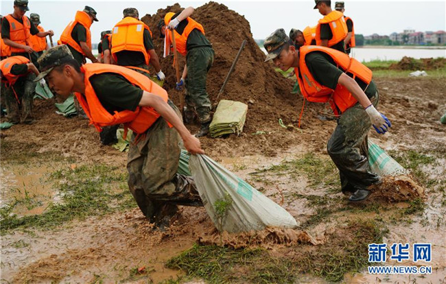 7月11日,武警戰(zhàn)士在江西省鄱陽縣鄱陽鎮(zhèn)江家?guī)X村搬運沙袋。 新華社記者 周密 攝