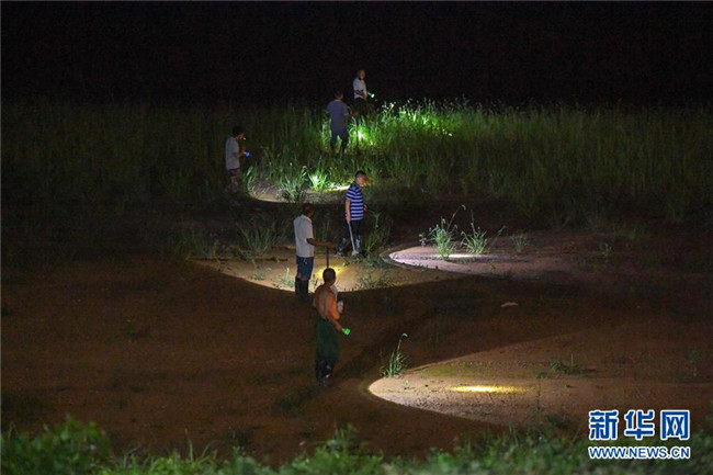 7月11日,位于湖南省岳陽市君山區(qū)的洞庭湖大堤上,工作人員和群眾在夜晚巡堤查險。 新華社記者 陳澤國 攝