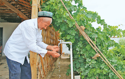 伊米提·艾山擰開(kāi)院子里的水龍頭洗手。記者 李亞楠攝