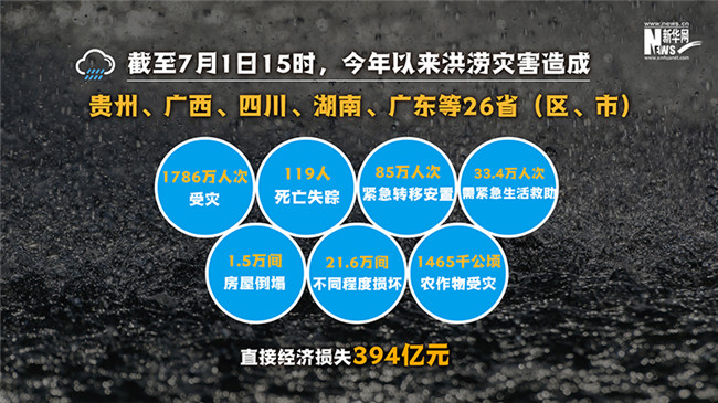 今年汛情帶來的破壞力有多強?張家團告訴記者,截至7月1日15時,今年以來洪澇災害造成貴州、廣西、四川、湖南、廣東等26省(區(qū)、市)1786萬人次受災,119人死亡失蹤,85萬人次緊急轉(zhuǎn)移安置,33.4萬人次需緊急生活救助;1.5萬間房屋倒塌,21.6萬間不同程度損壞;農(nóng)作物受災面積1465千公頃,其中絕收150千公頃;直接經(jīng)濟損失394億元。