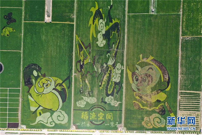 近日,寧夏銀川市賀蘭縣的稻漁空間鄉(xiāng)村生態(tài)觀光園的稻田畫進(jìn)入最佳觀賞期,園內(nèi)題材多樣的稻田畫成為一道別致的鄉(xiāng)村景觀。