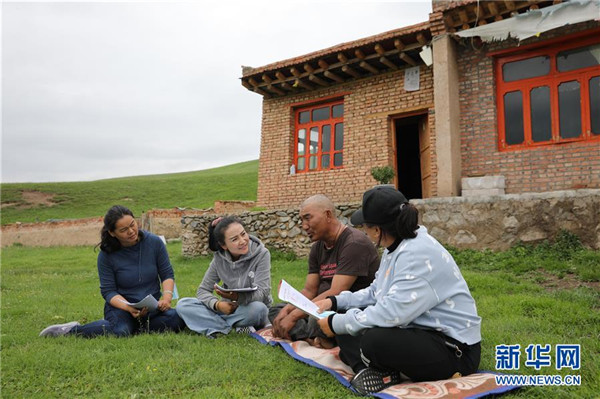 7月23日,在甘肅省甘南藏族自治州夏河縣桑科鎮(zhèn)崗岔村,卓瑪吉(左二)和駐村幫扶工作隊隊員一起入戶了解村民巴桑一家的生產(chǎn)生活情況。崗岔村是甘肅省甘南藏族自治州夏河縣??奇?zhèn)的一個牧業(yè)村,平均海拔3000米以上。2018年,在夏河縣文明辦工作的卓瑪吉開始擔(dān)任駐村幫扶工作隊隊長,每年都有200多天待在草原上。兩年來,卓瑪吉帶領(lǐng)大家開辦扶貧車間,發(fā)展特色產(chǎn)業(yè),聯(lián)系勞務(wù)輸出。為了讓村民更全面地了解精準(zhǔn)扶貧政策,卓瑪吉登門宣講政策。為了提高村容村貌,卓瑪吉發(fā)動大家開展廁所革命和庭院環(huán)境評比,積極響應(yīng)甘南藏族自治州“全域無垃圾”創(chuàng)建行動。她還從縣城請來醫(yī)生,為村民舉辦健康講座,在全村婦女中開展“兩癌篩查”。如今,崗岔村變成了干凈、整齊、富裕、美麗的生態(tài)文明村,提前實現(xiàn)了整村脫貧。談起心愿,卓瑪吉說:“要讓草原和草原上的人都變得更美。”新華社發(fā)(杜哲宇攝)