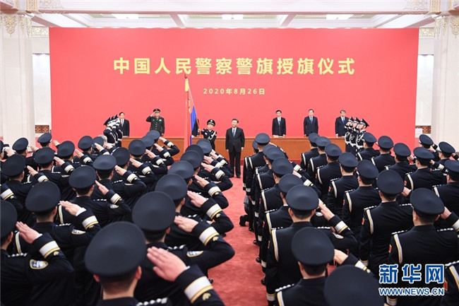 8月26日,中國人民警察警旗授旗儀式在人民大會堂舉行。中共中央總書記、國家主席、中央軍委主席習近平向中國人民警察隊伍授旗并致訓詞。 新華社記者 張領 攝