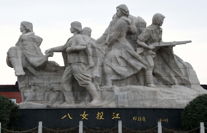她們是東北抗日聯(lián)軍第5軍婦女團的政治指導(dǎo)員冷云,班長胡秀芝、楊貴珍,戰(zhàn)士郭桂琴、黃桂清、王惠民、李鳳善和被服廠廠長安順福。1938年10月,該部在牡丹江地區(qū)烏斯渾河渡口與日偽軍千余人遭遇。已行至河邊準備渡河的婦女團8名成員,為掩護大部隊突圍,毅然放棄渡河,在冷云率領(lǐng)下,分成3個戰(zhàn)斗小組,與日偽軍展開激戰(zhàn)。她們主動吸引日偽軍火力,使部隊主力得以迅速擺脫敵人的攻擊,但她們卻被敵人圍困于河邊。在背水作戰(zhàn)至彈盡的情況下,面對日偽軍逼降,女戰(zhàn)士們誓死不屈。她們毀掉槍支,挽臂涉入烏斯渾河,高唱著《國際歌》,集體沉江,壯烈殉國。犧牲時,她們年齡最大的冷云23歲,最小的王惠民才13歲。