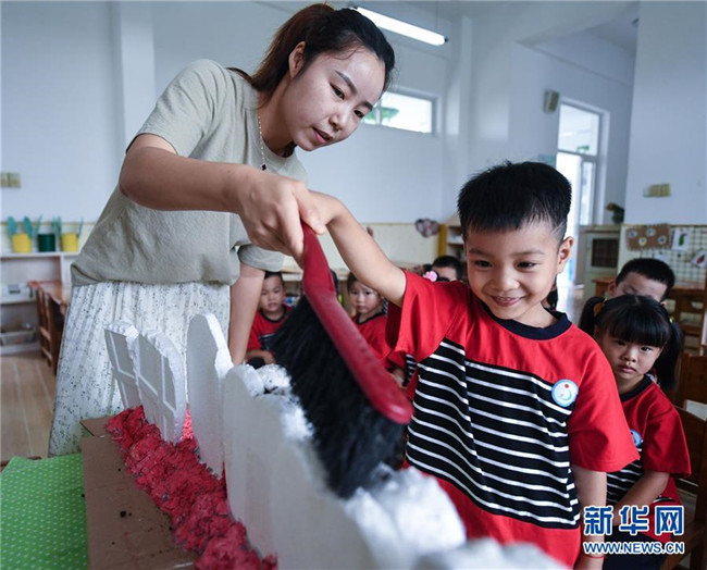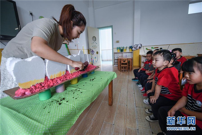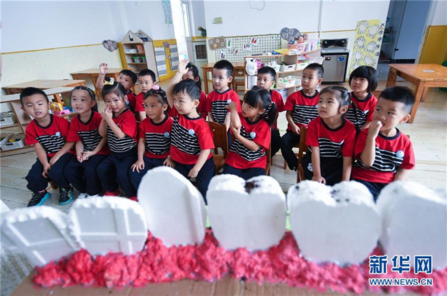 9月16日,老師利用模型給孩子講解牙齒、牙齦的結(jié)構(gòu)及正確的刷牙方式。新華社記者 徐昱 攝