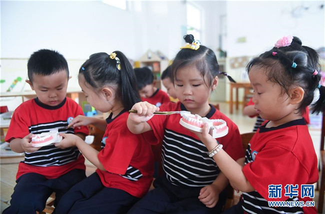 9月16日,孩子在學(xué)習(xí)正確的刷牙方式。新華社記者 徐昱 攝