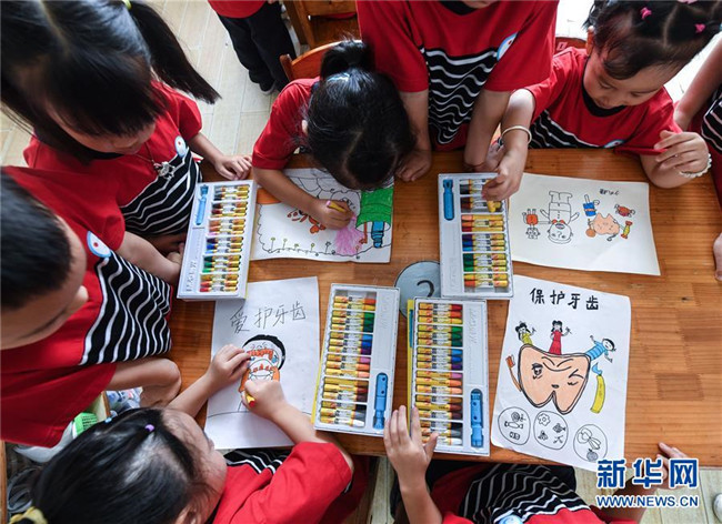 9月16日,孩子們?cè)趯W(xué)習(xí)正確的刷牙方式。新華社記者 徐昱 攝