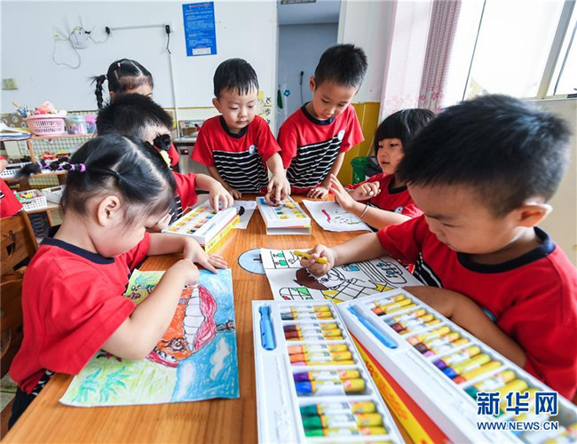 9月16日,孩子們?cè)诋嫄垩廊罩黝}宣傳畫。新華社記者 徐昱 攝