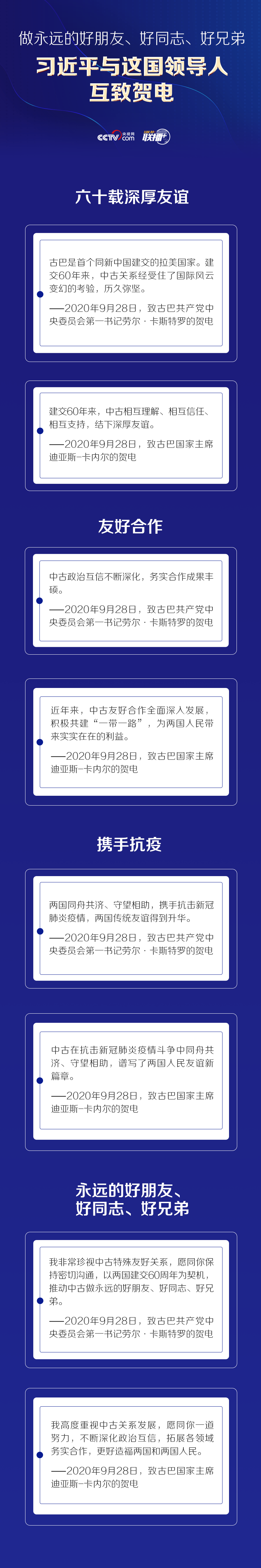 9月28日,中共中央總書記、國家主席習(xí)近平分別同古巴共產(chǎn)黨中央委員會第一書記勞爾·卡斯特羅、古巴國家主席迪亞斯-卡內(nèi)爾互致賀電,熱烈慶祝兩國建交60周年。