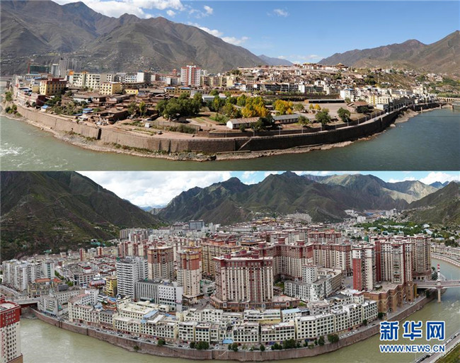 2010年拍攝的昌都市景色(上)和2020年拍攝的昌都市景色(拼版照片)。 新華社記者 普布扎西 攝