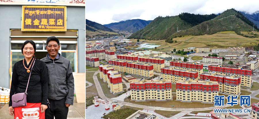 2020年9月22日拍攝的拼版照片:左圖為西藏自治區(qū)昌都市類烏齊縣長毛嶺鄉(xiāng)達(dá)雄村村民俄金(右)和妻子阿丁在安置點俄金蔬菜店前;右圖為類烏齊縣桑多扶貧開發(fā)區(qū)易地扶貧搬遷安置點一角(無人機(jī)照片)。 新華社記者 詹彥 攝
