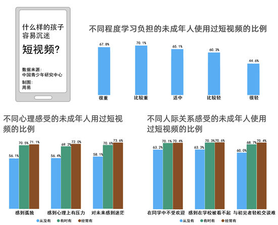 調(diào)查同時發(fā)現(xiàn),感到孤獨、心理上有壓力、對未來迷惘的中小學(xué)生接觸短視頻的比例更高。
