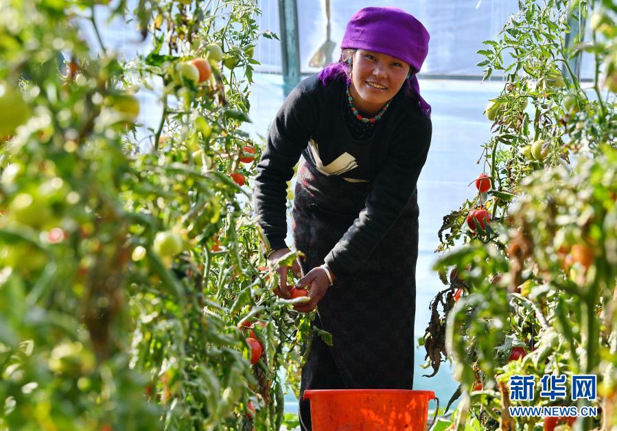 在西藏日喀則白朗國(guó)家級(jí)蔬菜標(biāo)準(zhǔn)化生產(chǎn)示范區(qū),白朗縣巴扎鄉(xiāng)查吾沖村村民次仁片多在蔬菜大棚里采摘西紅柿(3月2日攝)。新華社記者 張汝鋒 攝