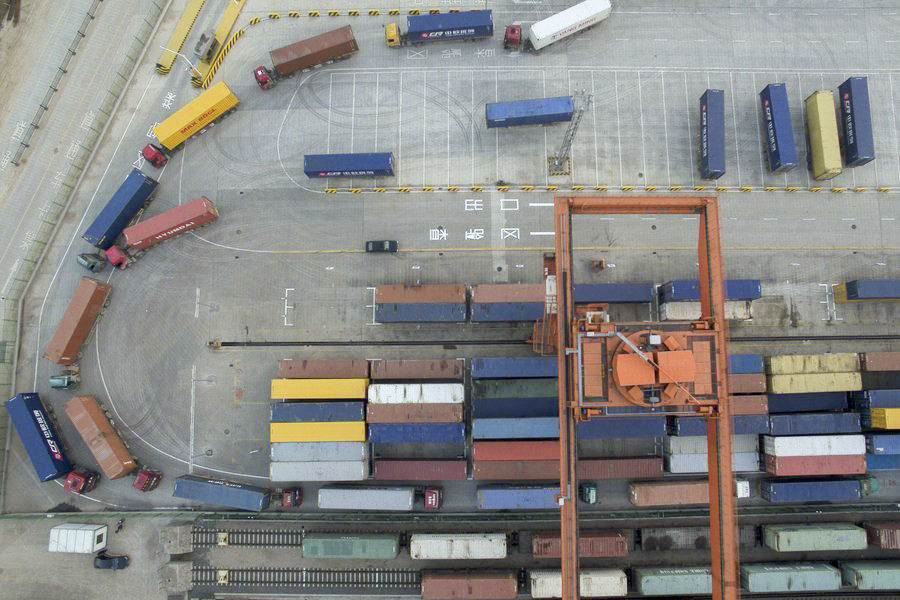 2016年12月28日,在浙江義烏火車西站,裝有中國出口商品集裝箱的貨車排隊進入一列中歐班列的裝卸區(qū)。 新華社記者 黃宗治攝