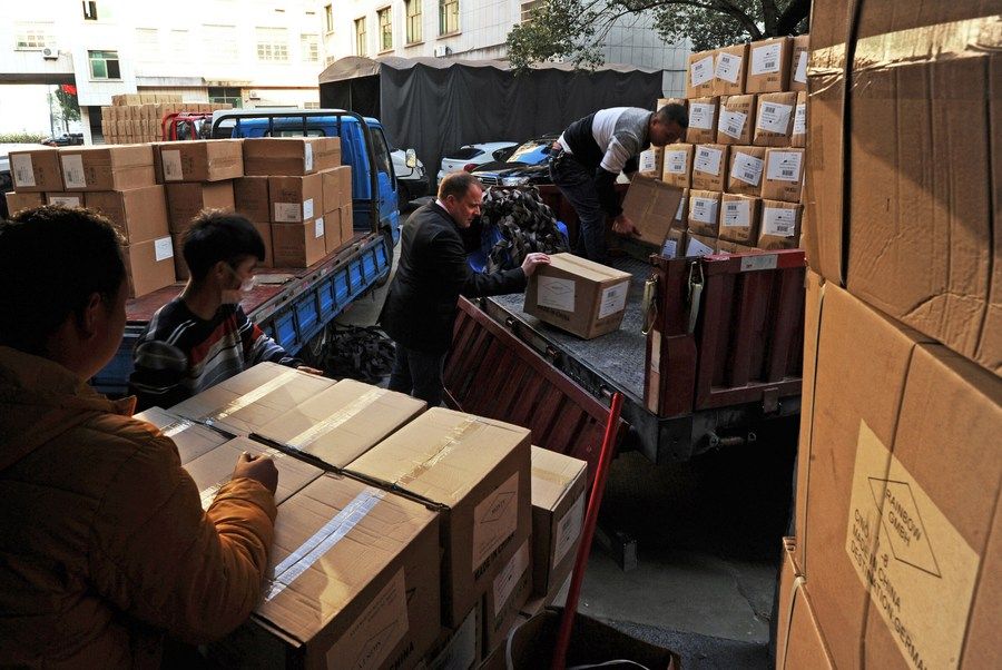 2019年11月28日,英國人奈杰爾(右二)在公司倉庫查驗一批出口貨物。 2005年初,奈杰爾來到浙江省義烏市國際商貿(mào)城,為這里的經(jīng)營戶培訓(xùn)英語。2014年11月以來,中歐班列(義烏)相繼開通了11條線路。自此,奈杰爾的進出口生意也有了新通道。新華社記者 譚進 攝