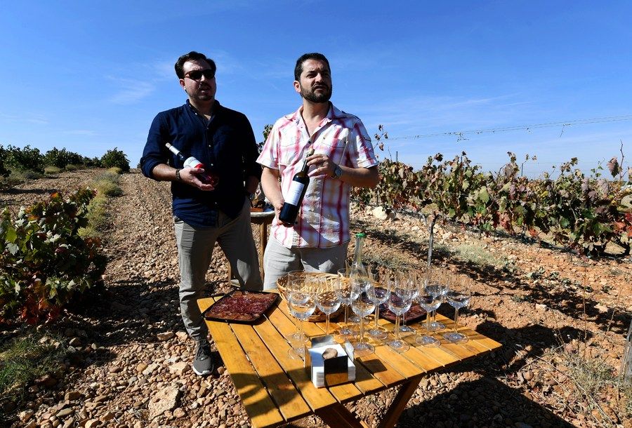 2017年9月24日,在西班牙葡萄酒產(chǎn)區(qū)巴亞多利德市的一處葡萄園內(nèi),兩名村民在展示當(dāng)?shù)蒯劸频钠咸?。這里的葡萄酒有一部分會通過“義新歐”班列出口到中國。新華社發(fā) (郭求達 攝)