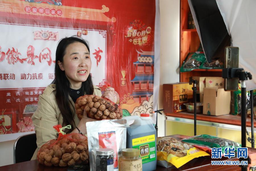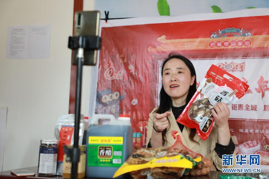 2月23日,在位于甘肅隴南市徽縣的店鋪中,全國(guó)人大代表梁倩娟在網(wǎng)上直播銷(xiāo)售當(dāng)?shù)剞r(nóng)特產(chǎn)品。新華社記者 張智敏 攝