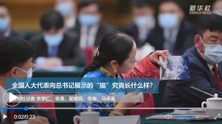 在會(huì)議現(xiàn)場(chǎng),全國人大代表、青海省海北藏族自治州門源回族自治縣教育局教研室副主任孔慶菊拿出兩張照片,向習(xí)總書記展示了兩種可愛的“貓”。