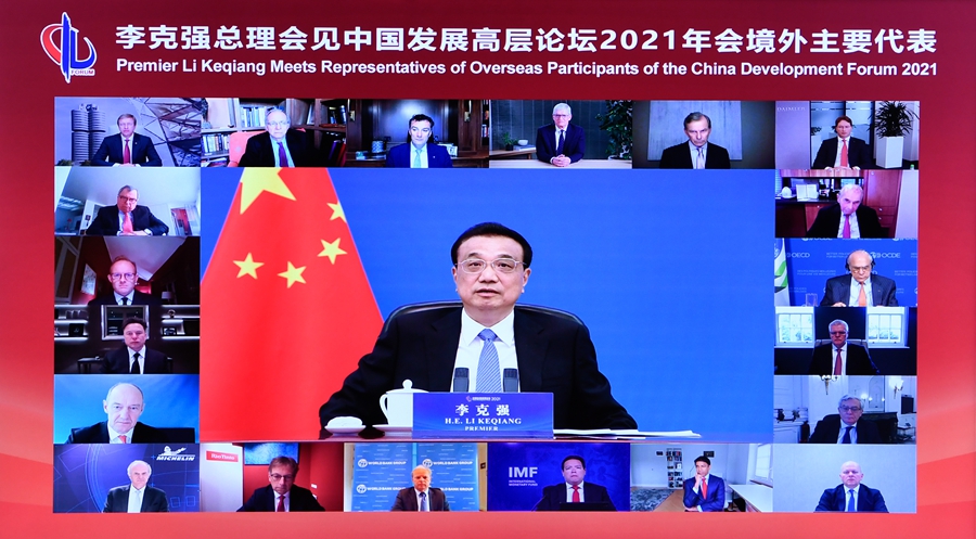國務(wù)院總理李克強(qiáng)3月22日晚在人民大會(huì)堂以視頻方式會(huì)見出席中國發(fā)展高層論壇2021年年會(huì)的境外代表。來自世界五百強(qiáng)企業(yè)的負(fù)責(zé)人、國際知名學(xué)術(shù)研究機(jī)構(gòu)的專家學(xué)者和主要國際組織代表等參加。