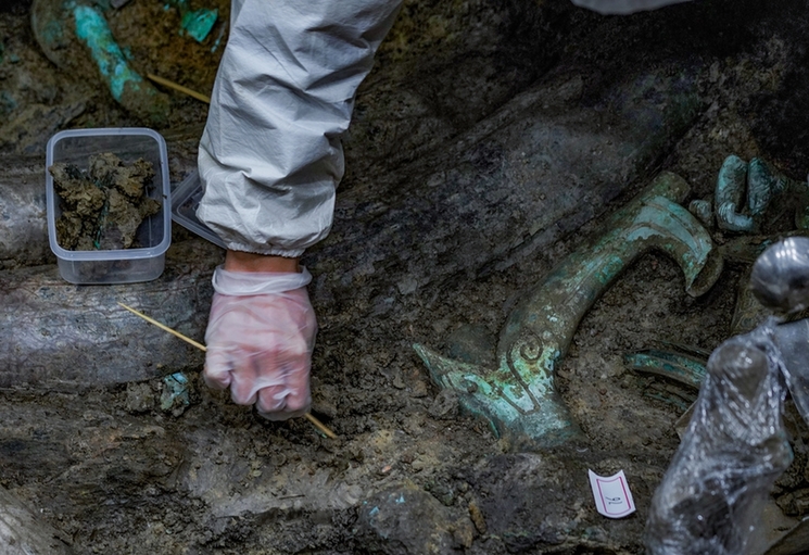 一鍬一鏟,叩問大地緘默。一擔(dān)一籃,剝除歷史塵封。三星堆遺址4號坑發(fā)掘人員許丹陽,每天的大部分工作就是拿著各種小刷子小鏟子刨土挖土。許丹陽也是一位90后,生于95年的他,去年從北京大學(xué)考古文博學(xué)院研究生畢業(yè)后,進入到四川省文物考古研究院工作。此次“入坑”三星堆,已經(jīng)是他的第二次。在2018年時,正在攻讀研究生的許丹陽就已經(jīng)來過三星堆進行學(xué)術(shù)研究,而這次剛參加工作就加入了三星堆祭祀?yún)^(qū)新一輪考古的隊伍,負責(zé)最先啟動的4號坑發(fā)掘,他感覺正逢其時。