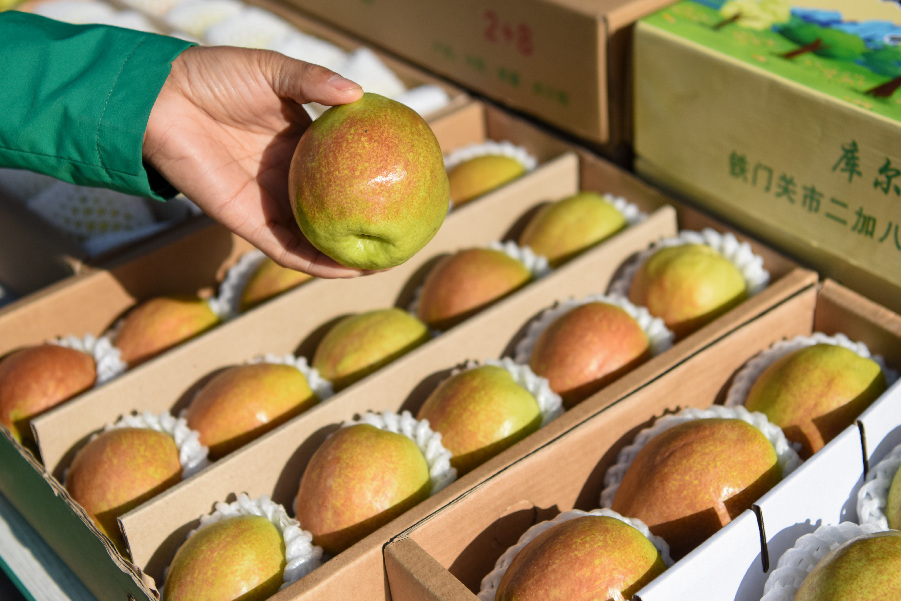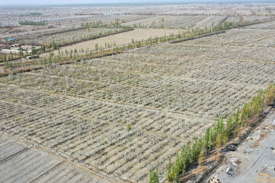 4月11日,在新疆鐵門關(guān)市一處香梨示范園里,無人機(jī)在執(zhí)行高效液體授粉作業(yè)。
