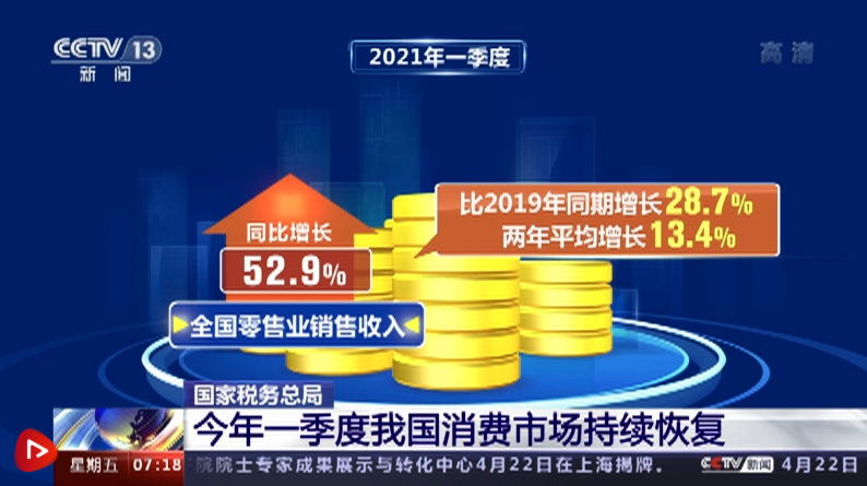 央視網(wǎng)消息:國(guó)家稅務(wù)總局?jǐn)?shù)據(jù)顯示,一季度,我國(guó)零售業(yè)銷售收入兩年平均增長(zhǎng)超10%,消費(fèi)市場(chǎng)持續(xù)恢復(fù)。