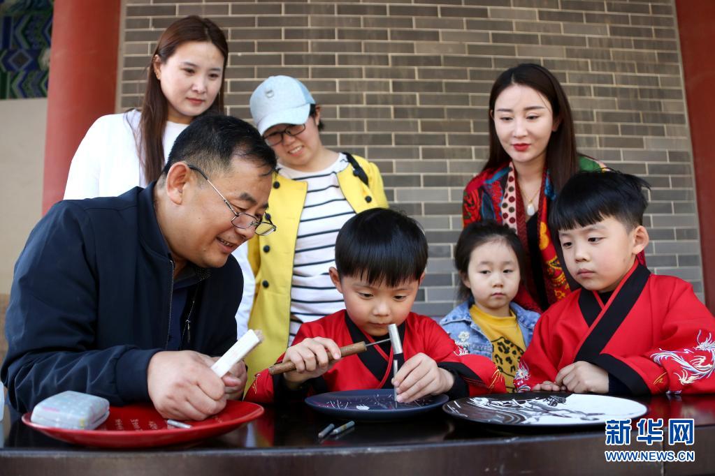 5月1日,在山東省棗莊市孟莊鎮(zhèn)境內的龜山風景區(qū),民間藝人胡安同(前左一)向小朋友傳授非遺刻瓷技藝。文化和旅游部5月5日晚間公布2021年“五一”假期旅游市場數(shù)據(jù)。統(tǒng)計顯示,5月1日至5日,全國國內旅游出游2.3億人次,同比增長119.7%,按可比口徑恢復至疫前同期的103.2%。新華社發(fā)(孫中喆 攝)