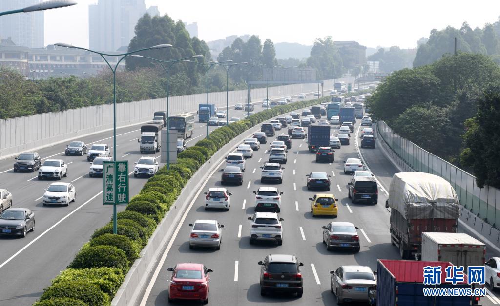 5月1日,廣州環(huán)城高速公路上車行緩慢。當日,廣州周邊高速公路迎來出行高峰。文化和旅游部5月5日晚間公布2021年“五一”假期旅游市場數(shù)據(jù)。統(tǒng)計顯示,5月1日至5日,全國國內旅游出游2.3億人次,同比增長119.7%,按可比口徑恢復至疫前同期的103.2%。新華社記者 盧漢欣 攝