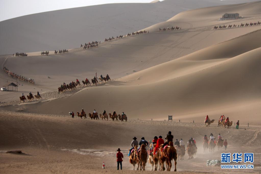 5月1日,游客在甘肅省敦煌市鳴沙山月牙泉景區(qū)游覽。文化和旅游部5月5日晚間公布2021年“五一”假期旅游市場數(shù)據(jù)。統(tǒng)計顯示,5月1日至5日,全國國內旅游出游2.3億人次,同比增長119.7%,按可比口徑恢復至疫前同期的103.2%。新華社發(fā)(張曉亮 攝)