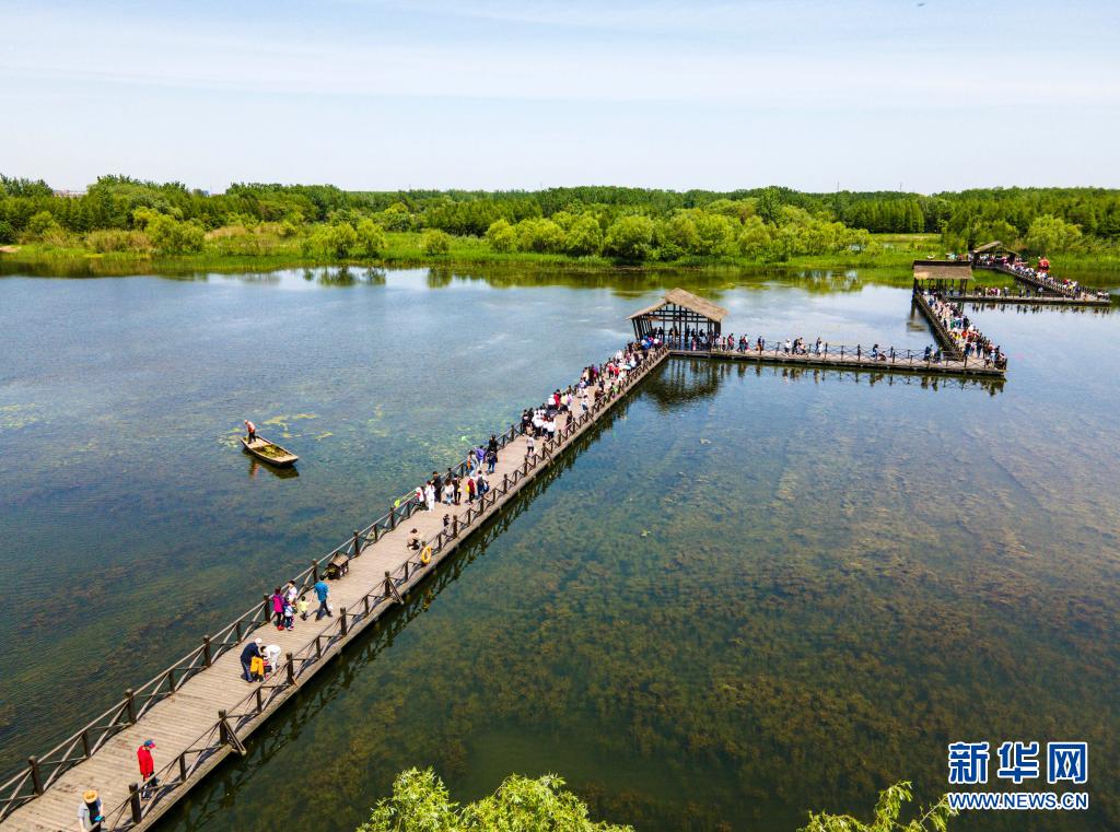 5月2日,游客在江蘇省泰州市姜堰區(qū)溱湖國家濕地公園棧道上游覽(無人機照片)。文化和旅游部5月5日晚間公布2021年“五一”假期旅游市場數(shù)據(jù)。統(tǒng)計顯示,5月1日至5日,全國國內旅游出游2.3億人次,同比增長119.7%,按可比口徑恢復至疫前同期的103.2%。新華社發(fā)(顧繼紅 攝)