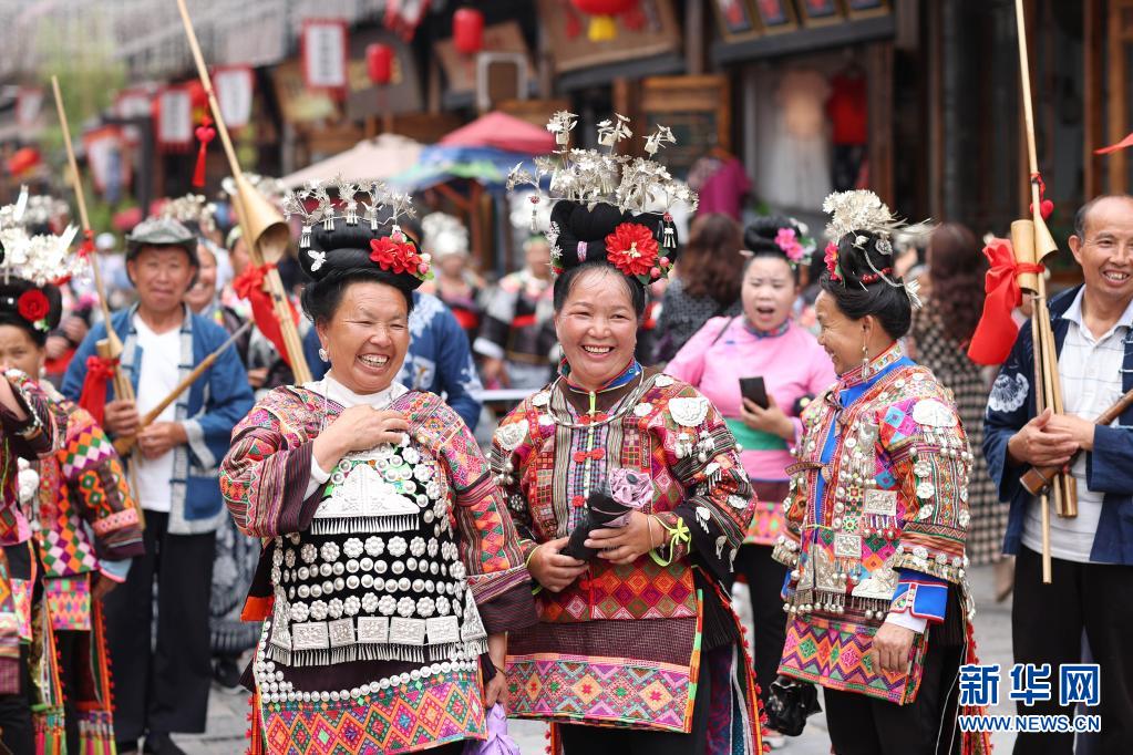 5月16日,身著盛裝的苗族群眾在丹寨萬(wàn)達(dá)小鎮(zhèn)參加服飾展示活動(dòng)。