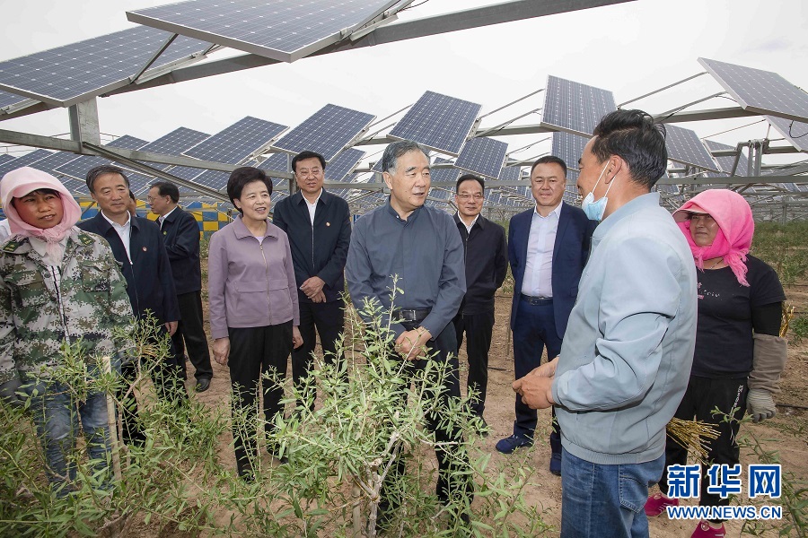 5月17日至19日,中共中央政治局常委、全國政協(xié)主席汪洋在寧夏調(diào)研。這是18日,汪洋在寶豐農(nóng)光一體化項目基地同工作人員親切交談。新華社記者 李濤 攝