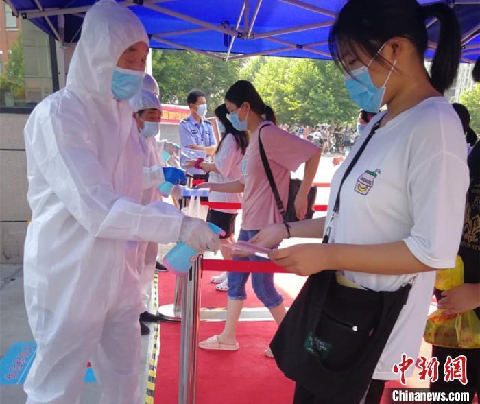 資料圖:2020年7月7日,河南鄭州,醫(yī)務(wù)人員為進入考點的考生進行體溫檢查和消毒。河南省衛(wèi)健委供圖