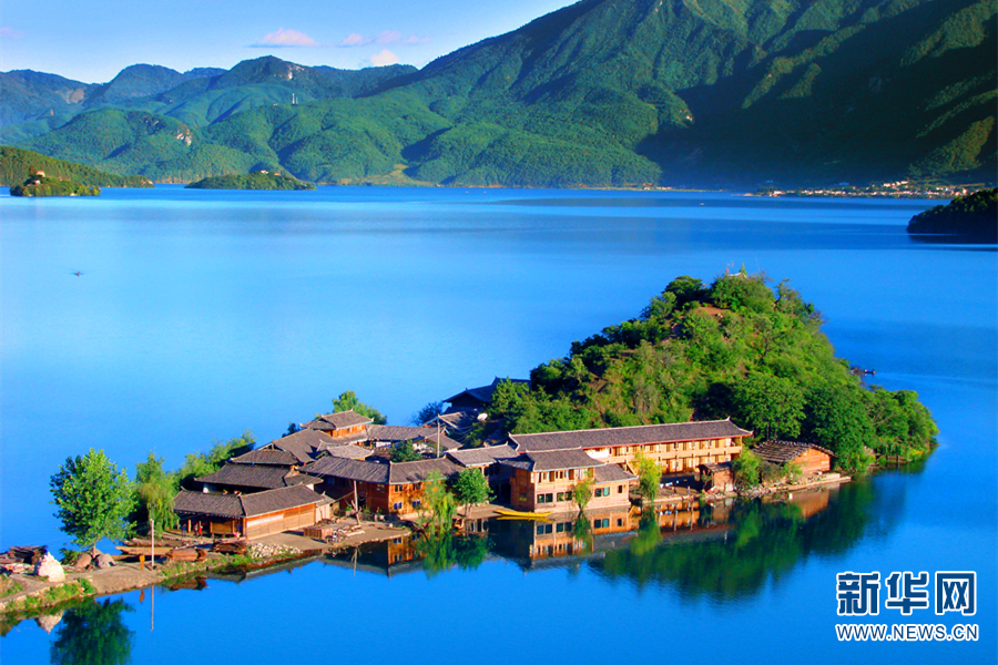 里格半島在藍天碧水的映襯下更加美麗動人。新華網發(fā)(麗江瀘沽湖管理局供圖)