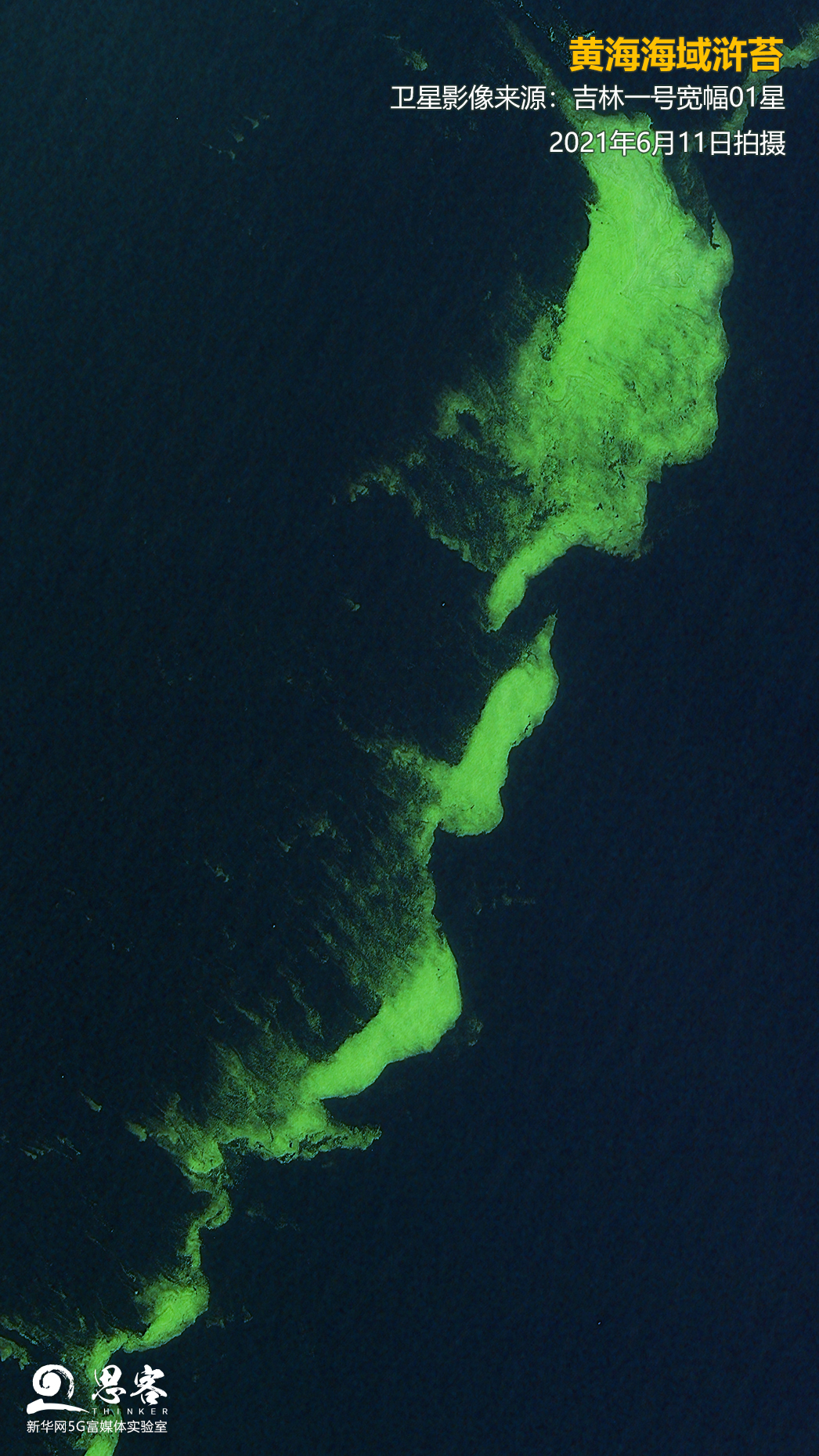 ▲圖為吉林一號寬幅01星2021年6月11日拍攝的黃海海域滸苔。