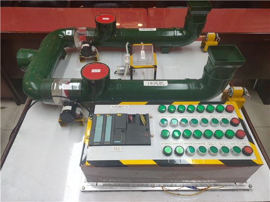 為實現(xiàn)主扇司機的實操培訓(xùn),切實提高運維人員在故障情況下的應(yīng)急處置能力,機電工區(qū)工作人員在充分了解主通風(fēng)機的設(shè)備性能的基礎(chǔ)上,深入鉆研設(shè)備電氣原理圖、重溫PLC基礎(chǔ)知識,特制作了一套微縮版的風(fēng)機模型。