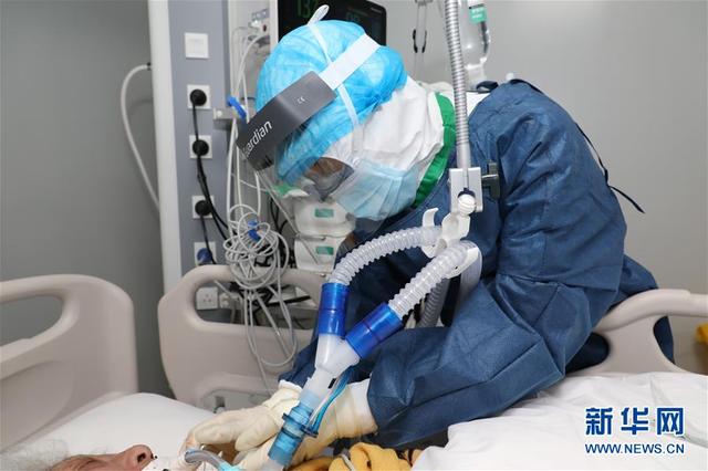 海軍軍醫(yī)大學(xué)第二附屬醫(yī)院急診、重癥醫(yī)學(xué)科護(hù)士長(zhǎng)陳靜在武漢火神山醫(yī)院為患者進(jìn)行氣管插管后的導(dǎo)管固定(2月19日攝)。新華社發(fā)(陳晨 攝)